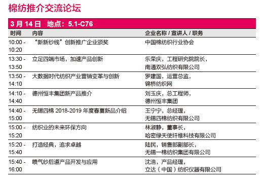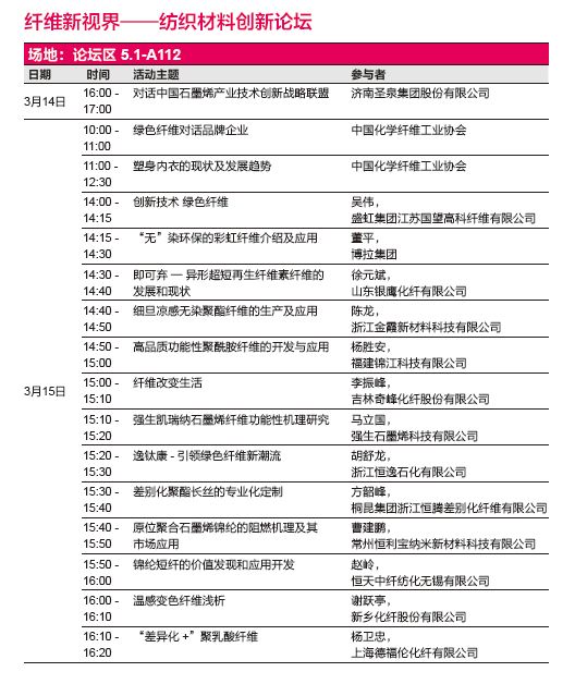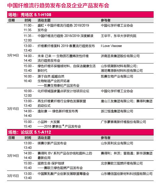 同期活动:中国纤维流行趋势发布、纺织材料创新论坛、棉纺推介论坛、企业发布秀、企业发布会、“新新纱线”推广活动