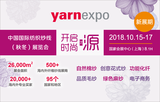 作为亚洲地区最具影响力,涵盖全品类纤维纱线的专业化、国际化、时尚化商贸、展示平台,第十五届中国国际纺织纱线( 秋冬) 展览会(以下简称yarnexpo2018秋冬纱线展),将于2018年10月15-17日,在国家会展中心(上海)8.1号馆与"中国国际纺织机械展览会暨ITMA亚洲展览会"同期同地举办。本届展会面积26,000 平方米,参展商逾400家,将多角度全景呈现纺织上游产业链的风采,践行从源头打造美丽服饰,创造美好新生活,体现"科技、时尚、绿色"新时代行业新定位的展会发展目标。